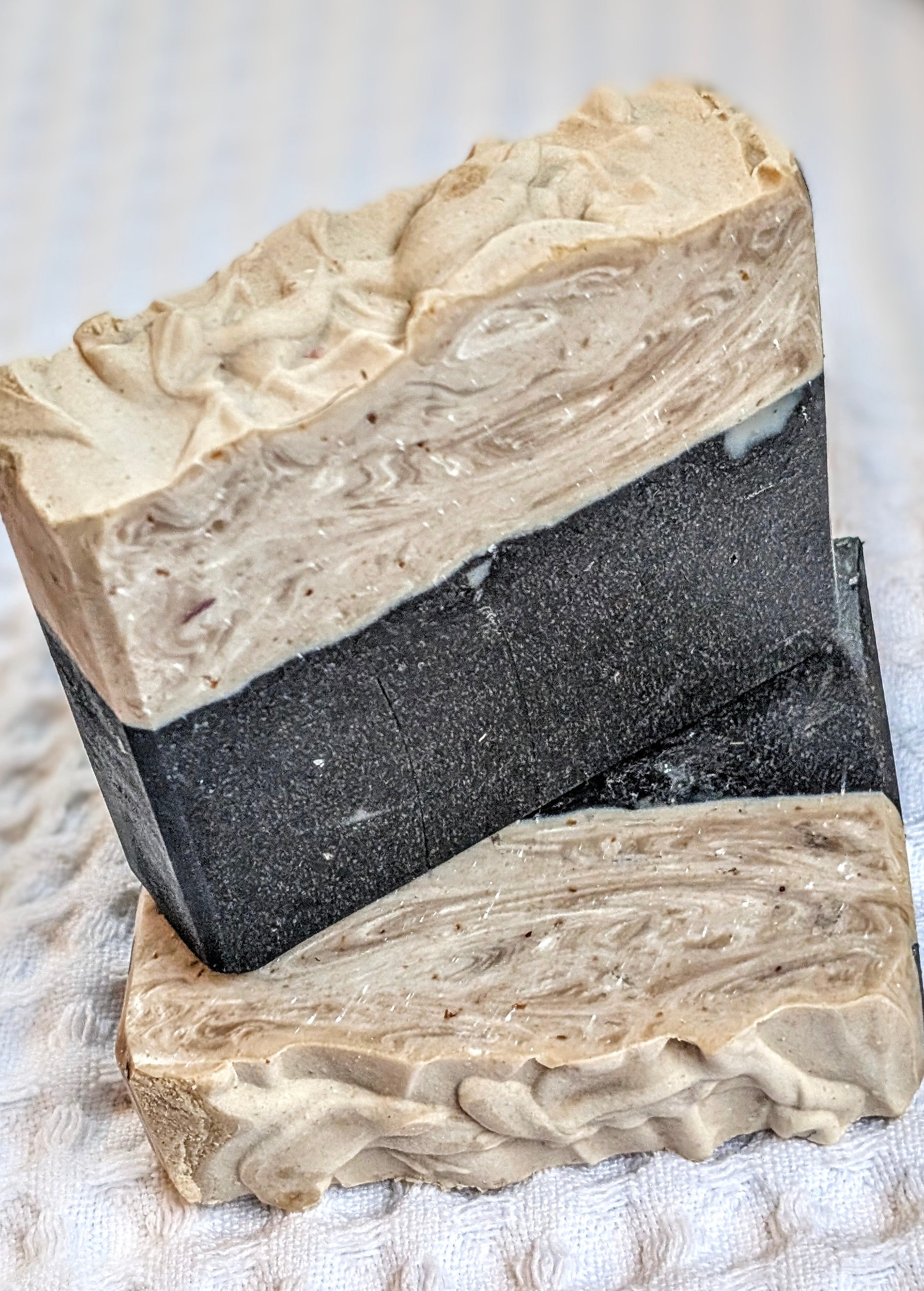Mellow Oatmeal tops Power Wash in this cleansing activated charcoal and tea tree oil bar with crushed walnut shells and Shea butter!